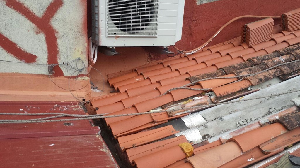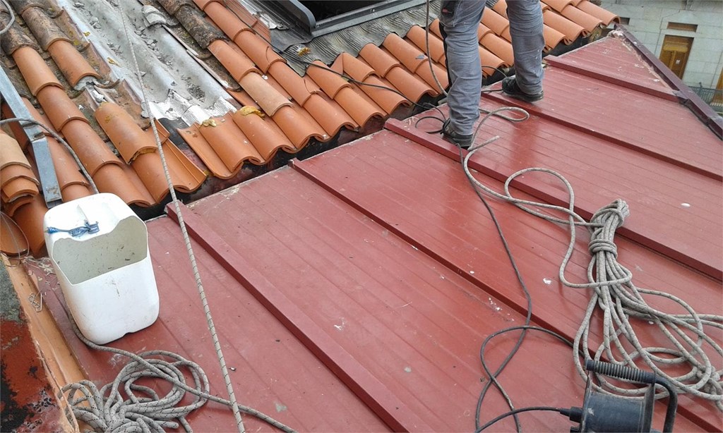 Se retira la teja vieja en muy mal estado. Se prepara el soporte para recibir las nuevas planchas de fibrocemento sin amianto con aislante, Naturtherm, para montar en toda la cubierta. Se fabrica un lucernario de aluminio soldado con vidrio, a la medida del hueco luz para iluminar el hueco de las escaleras desde el tejado. Una vez la cubierta lista con el aislamiento, se monta la teja Borja y la cumbrera ventilada. Todos los remates y canalones realizados en aluminio soldado y fabricados a la medida. La cubierta se ha realizado en su totalidad sin cemento.