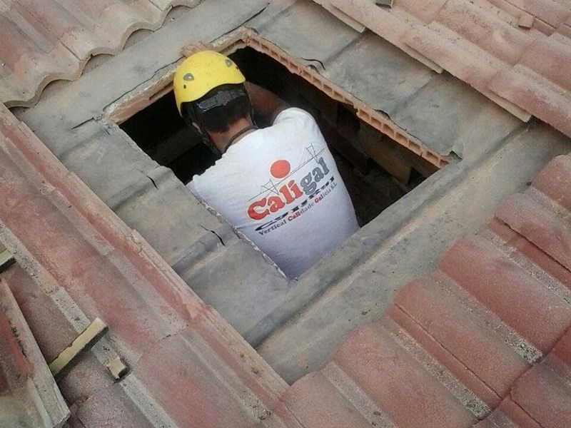 Se retira la teja vieja en muy mal estado. Se prepara el soporte para recibir las nuevas planchas de fibrocemento sin amianto con aislante, Naturtherm, para montar en toda la cubierta. Se fabrica un lucern...